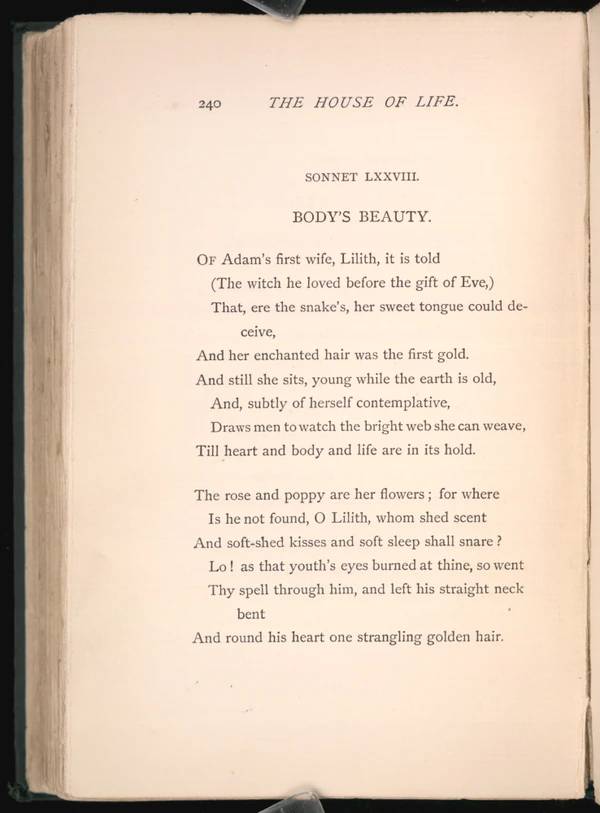 На раме картины начертан сонет авторства самого Россетти Красота души[16], на раме «Леди Лилит» же написан другой сонет. Пары картин и сонетов были впервые опубликованы вместе Алджерноном Чарльзом Суинбёрном в 1868 году. В 1870 стихотворения были опубликованы в сборнике Россетти «Сонеты для картин». В 1881 году Россетти переименовал сонет «Лилит» в «Красоту тела» и опубликовал два сонета рядом в книге «Дом жизни» тем самым напрямую объединив пару контрастных произведений[16][17].