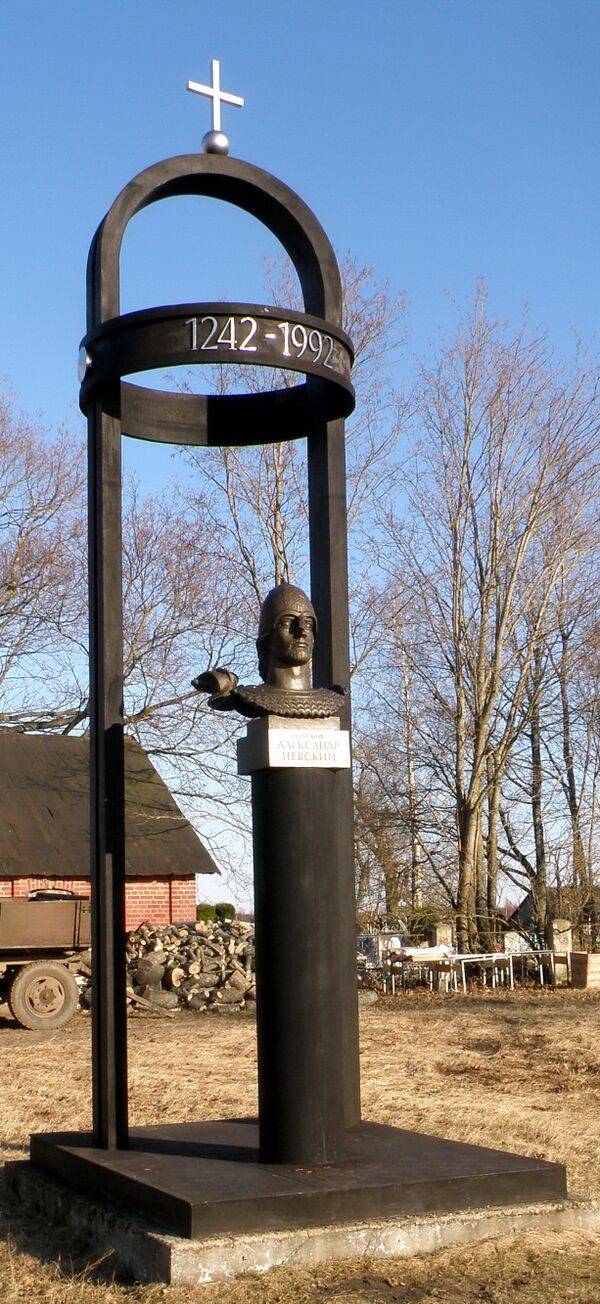 Мемориальный комплекс создан в 2021 году на месте Ледового побоища. 15-метровый монумент, увековечивающий момент возвращения Александра Невского с дружиной из победного боя, весит больше сорока тонн и установлен на шестиметровом кургане, для создания которого уложено почти семьдесят тысяч тонн песка. Скульптура отливалась по частям, которые поднимались наверх с помощью крана высотой 63 метра[35].