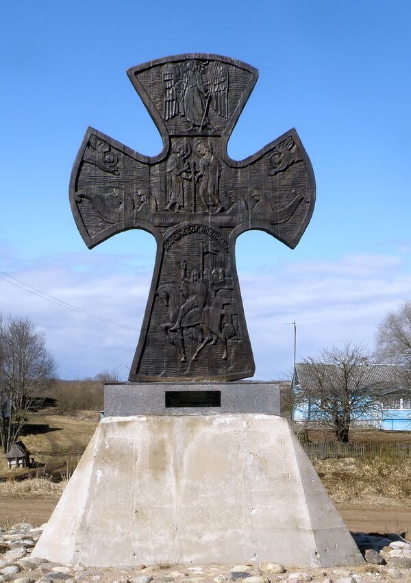 В 1992 году мастера В. Рещиков, П. И. Самсонов, А. Шерстнев, В. Большаков и И. С. Рущенко из брусьев вырезали памятный крест по образу новгородского Алексиевского креста[28]. В 1992 году на территории села Кобылье Городище Гдовского района[29] в месте, максимально приближенном к предполагаемому месту Ледового побоища, у церкви Архангела Михаила[Прим 1] был установлен бронзовый памятник Александру Невскому работы скульптора В. Г. Козенюка и деревянный поклонный крест[30][31]. Деревянный крест постепенно разрушался под действием неблагоприятных погодных условий[32].