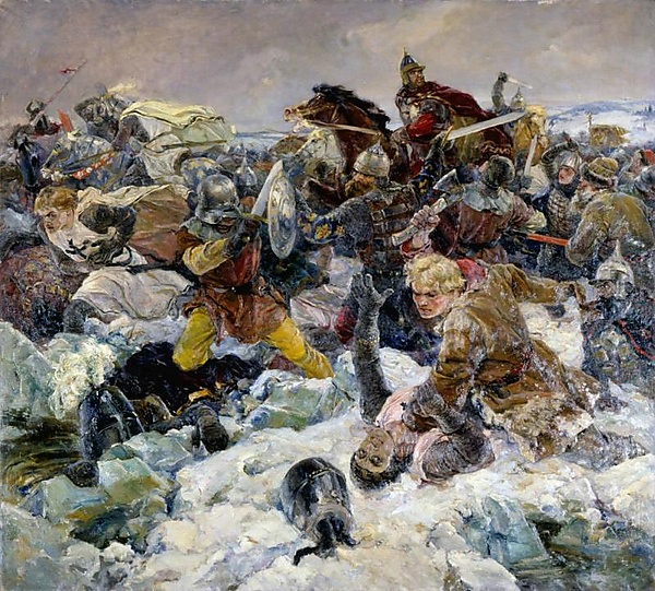 На переднем плане изображены лёд и вода, на которых лежит шлем, сорванный с головы немецкого рыцаря, которого душит молодой русский воин. В центре композиции русский воин в шлеме и латах заносит меч над немецким противником. Слева видны голова в шлеме и рука немецкого рыцаря, уходящего под лёд. На втором плане разворачивается сражение между русскими и немцами. Вдали просматриваются холмистые заснеженные дали и серое облачное небо, подчёркивающие драматизм батальной сцены.