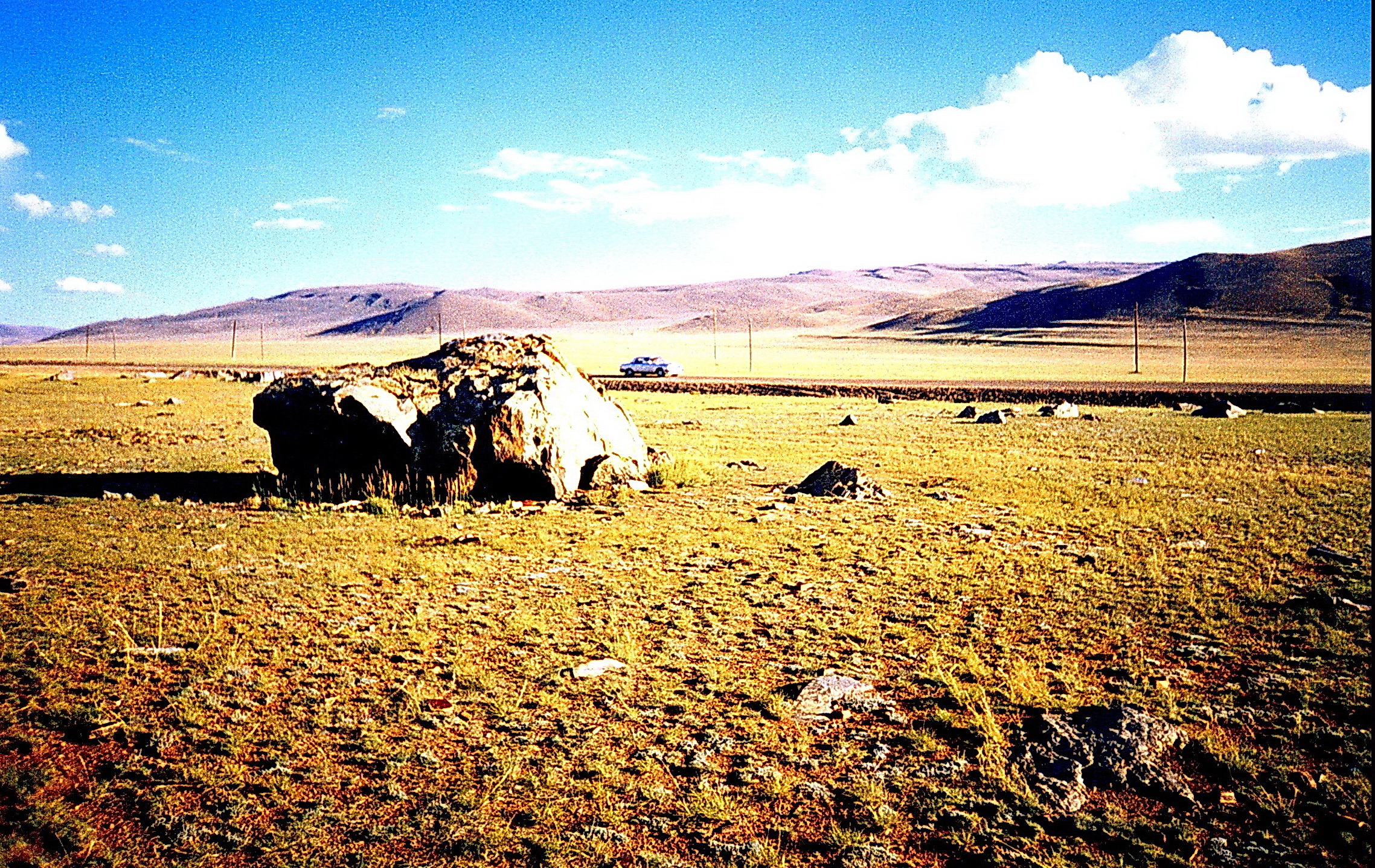 | Поле дропстоунов на днище Чуйского позднечетвертичного ледниково-подпрудного озера. На заднем плане — северный склон хребта Сайлюгем, на котором отчётливо видны озёрные террасы. Эти террасы — следы ледниково-подпрудного озера, в которое спускались горные ледники и продуцировали айсберги, один из которых и оставил эти дропстоуны на этапе сброса озера (около 15 тысяч лет назад[19]). | Центральная часть современного ложа Чуйского позднечетвертичного ледниково-подпрудного озера. Для масштаба на передний план приведены верблюды. На заднем плане видны частично обрамляющие Чуйскую котловину Южно-Чуйский и отроги Северо-Чуйского хребта. |