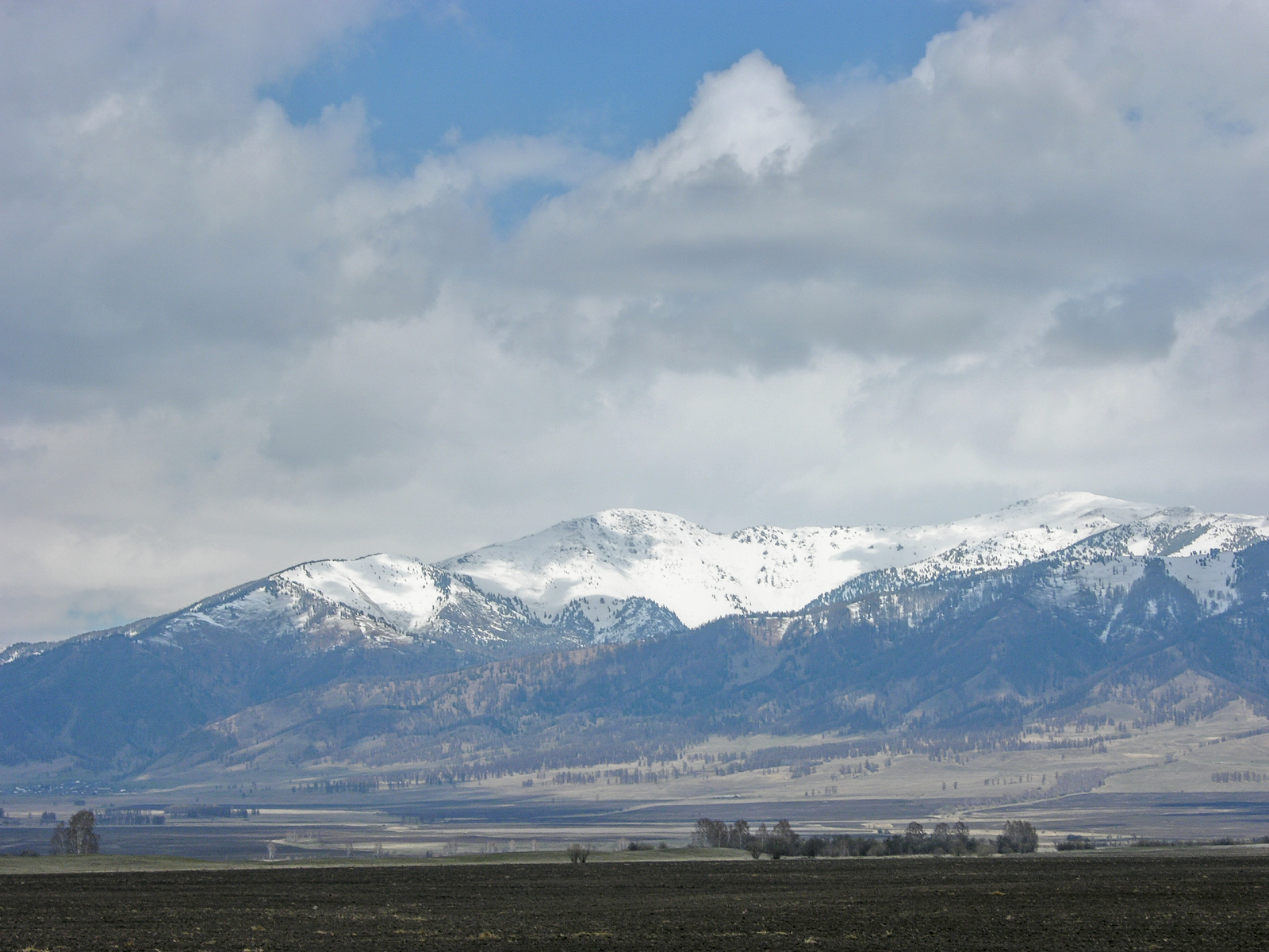 Уймонская котловина зимой. Снято со склона Теректинского хребта через днище котловины на отроги Катунского хребта. Внизу — деревня Чендек. |