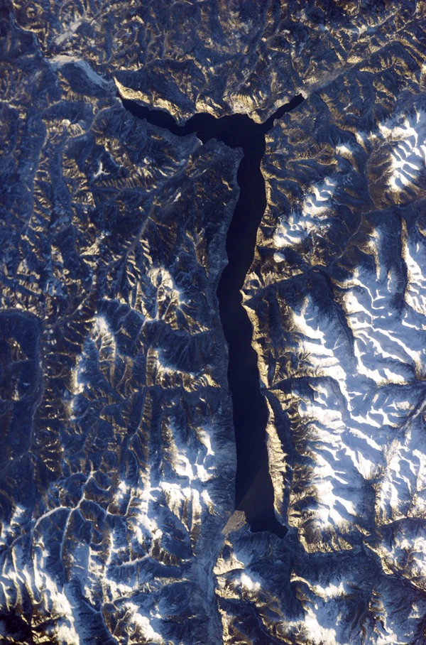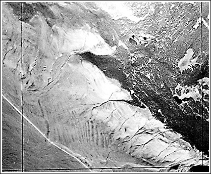 | Озёрные террасы позднечетвертичного (около 15 тыс. лет назад) Курайского ледниково-подпрудного озера на южном склоне Курайского хребта. Белая полоса — Чуйский тракт направо — к пос. Кош-Агач. Высота верхних озёрных уровней превышает 2200 м над уровнем моря при средних отметках современного днища Курайской котловины — ниже 1600 м. Аэрофотоснимок. | ||||