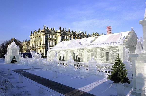 В России первой ледяной постройкой был Ледяной дом, сооружённый в 1740 году для императрицы Анны Иоанновны архитектором Петром Еропкиным и академиком Георгом Крафтом. Ледяной дворец построили на Неве, вся мебель и утварь в нём были изо льда. 6 февраля того же года в Ледяном доме состоялась «потешная свадьба» царского шута князя Михаила Голицына и любимой шутихи императрицы Авдотьи Бужениновой. В 2006 году на Дворцовой площади Санкт-Петербурга по сохранившимся чертежам и описаниям был воссоздан этот необычный архитектурный комплекс[2].