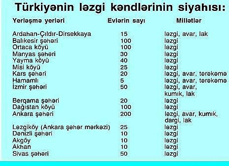 Сегодня в Турции лезгины проживают в населенных пунктах Ортажа(лезг. Кӏирне), Яйлакёй (Балакесир вилайат), Дагестан (около Бергамы), Гюнейкин (около Яловы), Финдиджак (около Измира), Каялипинар, Эмилрлер, Селимие, Османие, Султание (в провинции Сивас) также проживают в Иршадие, Бурса, Измир, Стамбул, Анкара и других крупных городах[3].