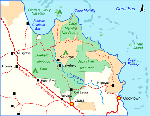 Национальный парк Лейкфилд занимает территорию 5 370 км2 и находится в восточной части полуострова Кейп-Йорк. Расстояние до Кэрнса составляет 410 километров. Северная часть парка омывается водами Кораллового моря.
