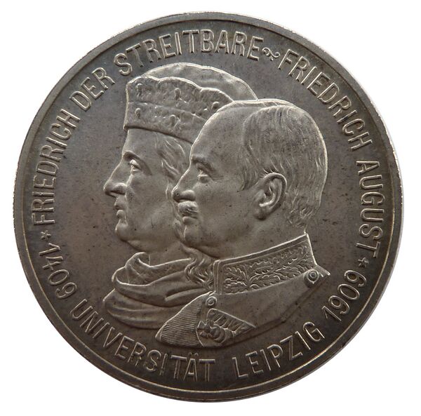 На аверсе монет изображены курфюрст Саксонии Фридрих Воинственный при котором открылся университет и король Фридрих Август III, который правил в 1909 году.