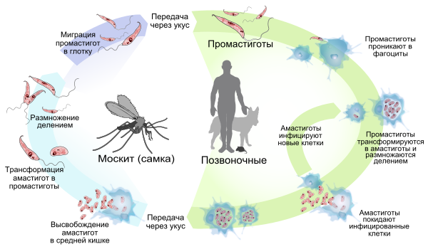 Промастиготы лейшманий размножаются в пищеварительном канале самок москитов. Приблизительно через неделю инфекция распространяется до верхних отделов пищеварительного канала москита, и паразиты блокируют просвет канала своими телами и секретируемым ими гелем. Когда самка кусает потенциального хозяина, она выделяет в кожу свою слюну. Самка с блокированным пищеварительным каналом не может глотать, и у неё возникают спастические движения, в результате которых она отрыгивает промастиготы в ранку на коже хозяина[9].