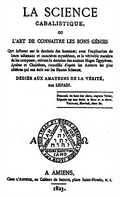 Lenain, «La Science cabalistique, ou l’art de connaître les bons génies qui influent sur la destinée des hommes; avec l’explication de leurs talismans et caractères mystérieux, et la véritable manière de les composer; suivant la doctrine des anciens Mages Égyptiens, Arabes et Chaldéens, recueillie d’après les Auteurs les plus célèbres qui ont écrit sur les Hautes Sciences», Paris, Éditions traditionnelles, 1963 (переиздания 1972, 1979, 1989)