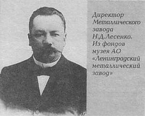 В начале 1890-х годов на заводе появился первый русский инженер Н. Д. Лесенко[2]. Он быстро завоевал прочный авторитет как конструктор. По требованию министра финансов С. Ю. Витте, в ведении которого также состоял департамент торговли и промышленности и который взял курс на обрусение завода, Н. В. Лесенко был назначен заместителем директора. Впоследствии он занял пост директора завода.