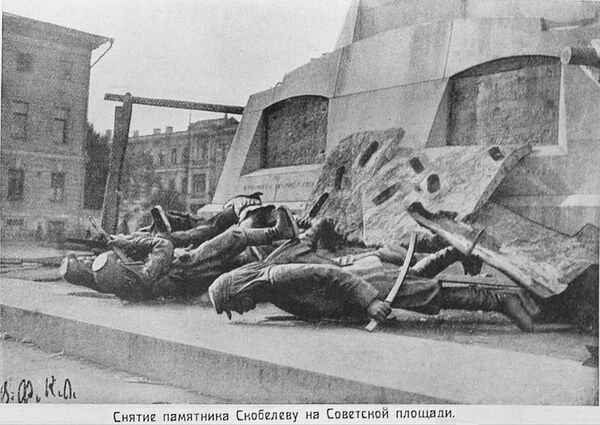 В число «царских слуг» попал герой Русско-турецкой войны генерал М. Д. Скобелев, памятник которому установили в 1912 году на Тверской площади, тогда же получившей название Скобелевской. Как писали газеты, снос памятника начался летом 1918 года, якобы по инициативе рабочих завода Гужона (позднее «Серп и Молот»), без всякого принуждения со стороны новой власти; о ходе сноса памятника Скобелеву регулярно докладывали В. И. Ленину[22].