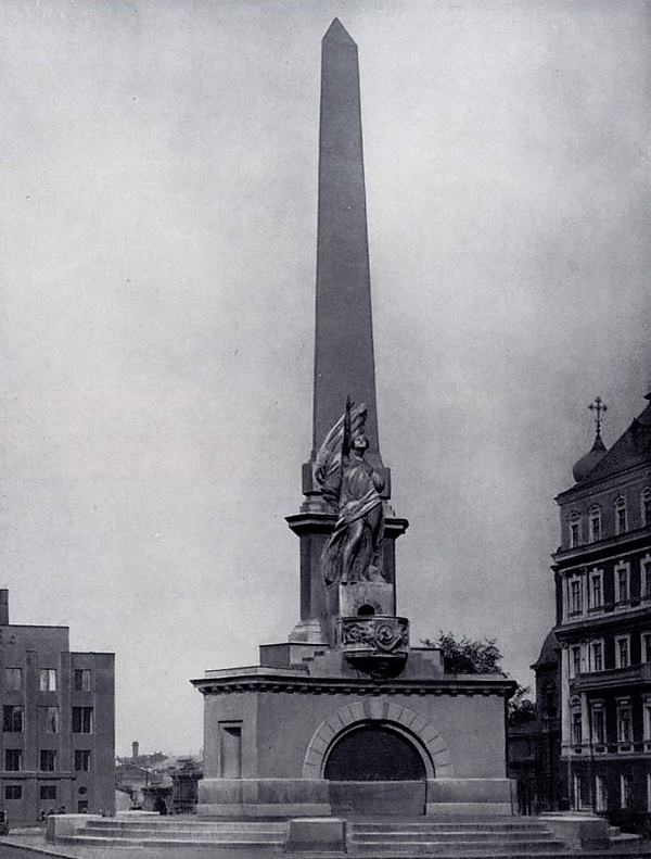 К первой годовщине Октябрьской революции 7 ноября 1918 года на улицах и площадях Москвы было открыто 12 монументов. Наиболее значимым среди них был обелиск, посвящённый первой советской конституции, через полгода дополненный статуей свободы[28]. По мнению некоторых исследователей, монумент Советской Конституции — одно «из лучших произведений ленинского плана монументальной пропаганды»[29]. Однако кирпичный обелиск с бетонной статуей быстро обветшал, простояв всего лишь около 20 лет; в 1941 году его снесли при расчистке площади.