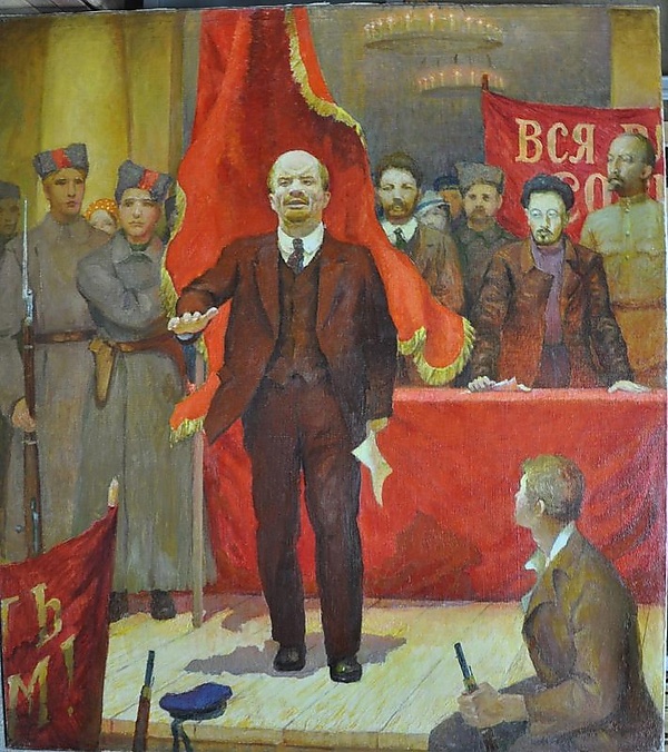 В центре композиции изображён В. И. Ленин, стоящий на деревянном помосте на фоне красного знамени. Ленин представлен в полный рост, фронтально, с вытянутой вперёд правой рукой и белым листом бумаги в левой. Он одет в коричневый костюм-тройку, белую рубашку и галстук. Внизу справа на помосте сидит мужчина, а позади Ленина слева расположены два солдата. Справа на фоне красного транспаранта размещена надпись о соратниках Ленина по коммунистической партии.