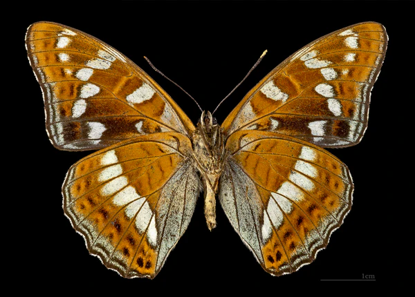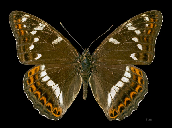 Длина переднего крыла — 35—46 мм[3][4]. Размах крыльев самцов 65—77 мм, самок — 78—85 мм. Верхняя сторона крыльев у обоих полов тёмно-бурая, иногда почти чёрная, с более или менее заметным зеленовато-голубым отливом. На верхней стороне передних крыльев располагаются белые пятна у вершины крыла, удлинённое пятно в центральной ячейке, а также большая поперечная перевязь, состоящая из разрозненных пятен. На верхней стороне задних крыльев проходит широкая поперечная белая перевязь, а также прикраевая полоса, состоящая из оранжевых серповидных пятен-лунок. Нижняя сторона крыльев оранжевая либо ярко-оранжевая с голубоватым, сизым или зеленоватым окаймлением, контрастными чёрными полями у заднего края переднего крыла, а также белыми перевязями и пятнами[4][5][6].