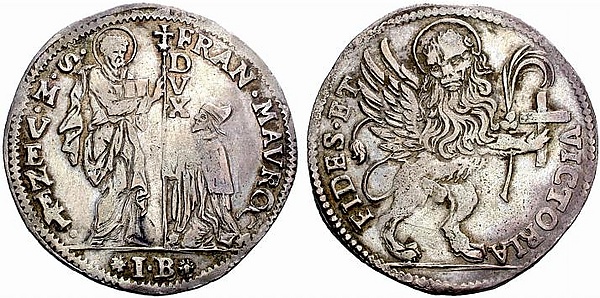 На аверсе монеты находилось изображение апостола Марка, который передаёт коленопреклонённому дожу крест, на реверсе — льва святого Марка в прыжке[1][2].