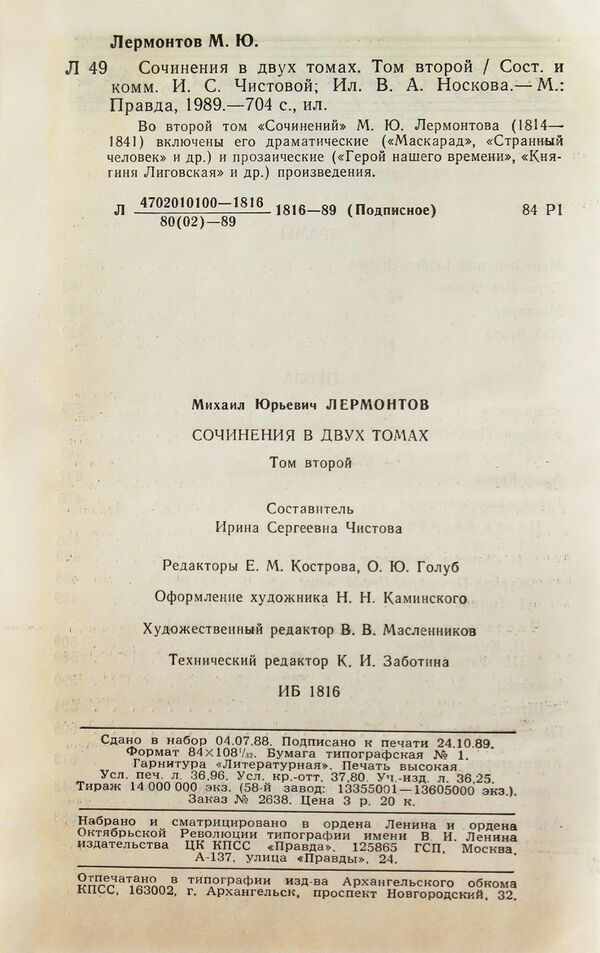 - М. Ю. Лермонтов. Сводный каталог лермонтовских материалов в собраниях ИРЛИ РАН / СПб.: Издательство Пушкинского Дома, 2014. — 496 л.: илл. — ISBN 978-5-87781-043-3