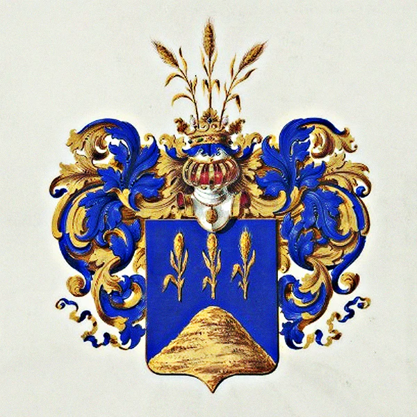 Щит увенчан дворянским коронованным шлемом. Нашлемник: три золотых колоса. Намёт: лазоревый с золотом. Герб дворянского рода был записан в Часть XII Общего гербовника дворянских родов Всероссийской империи, страница 61[2].