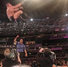 Он выбросил Гробовщика последним и выиграл матч, что гарантировало ему матч за звание чемпиона WWE на WrestleMania XIX, поскольку он был рестлером SmackDown![29]. После Royal Rumble Леснар и Крис Бенуа победили Энгла, Хааса и Бенджамина в матче с гандикапом на No Way Out 23 февраля[29]. На WrestleMania 30 марта Леснар победил Энгла и завоевал свой второй титул чемпиона WWE; во время матча он неудачно выполнил приём Shooting Star Press (прием, который он неоднократно использовал в OVW) и приземлился на голову и шею, что привело к сотрясению мозга. Это заставило Энгла (который вышел на матч со сломанной шеей) и Леснара импровизировать завершение матча.