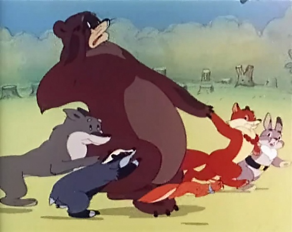 Медведь крадёт улей, затем хитрым способом вытесняет оттуда пчёл (закрыв окошко улья, забирается сам в водоём, держа улей над поверхностью воды, открывает окошко, и пчёлы улетают) и наедается мёду. Но за свою хитрость он быстро расплачивается: у него начинает сильно болеть зуб. Медведь ревёт и ревёт, так и перебудил всех жителей леса. Все пытаются помочь разными способами — ничего не получается, но они не хотят обращаться к доктору. В конце концов зайчонок не выдерживает и зовёт зубного врача Журавля. Тот с большими усилиями вырывает медведю зуб, ставит золотой, выкованный кротами, и даёт зубную щётку и порошок. Медведь благодарит всех за помощь.