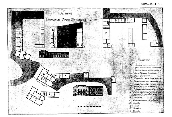 Первый каменный (кирпичный) 2-этажный с мезонином корпус для классов, столовой и дортуаров был построен (1826) по проекту и под руководством архитектора А. Д. Неллингера. По оси здания проходил коридор, а по обе его стороны находились учебные классы. Выходы из здания располагались по краям и были обращены на север. Во внутреннем дворе находился сад. Часть второго этажа и третий этаж были заняты общими спальнями для учащихся. В остальных помещениях находились классы и столовая.