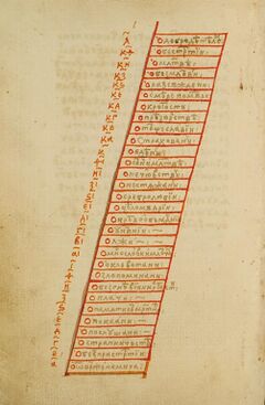 Иллюминированные рукописи Лествицы, наглядно представляющие идеалы монашеской аскетики, появляются во второй половине XI века. Некоторые содержат развёрнутый цикл иллюстраций различных ступеней покаяния и аскезы, но изначально в греческих рукописях было лишь выполненное чернилами изображение лестницы с тридцатью ступенями, увенчанной крестом[6].