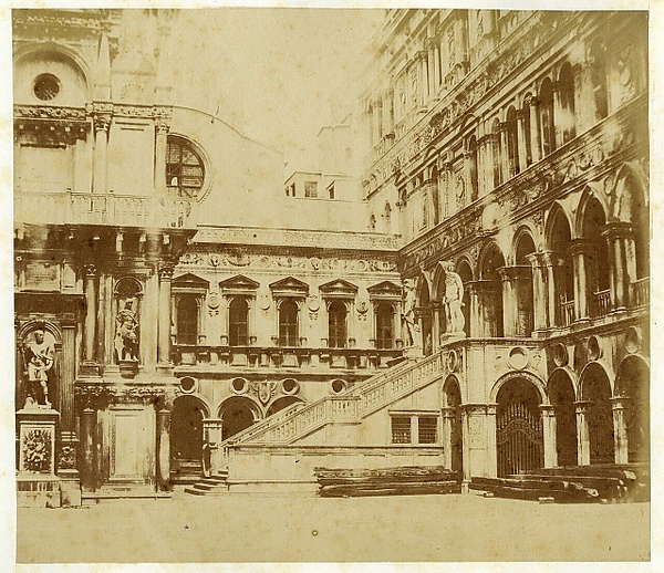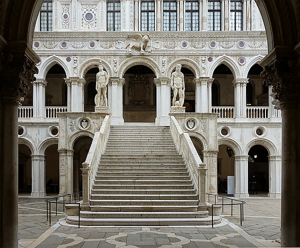 Парадная лестница служила не только входом в помещения второго этажа дворца, но имела и представительское значение. На верхней площадке ранее проходили церемонии венчания венецианских дожей. На площадках лестничных маршей оглашали декреты венецианского Сената, здесь начинались и заканчивались важные государственные встречи и приёмы. В качестве символического пожелания удачной карьеры на двух опорах перил по сторонам укреплены две мраморные корзины с изображениями символических даров природы — зрелых фруктов. По сторонам круглых медальонов с гербами рельефные изображения ник, богинь победы.