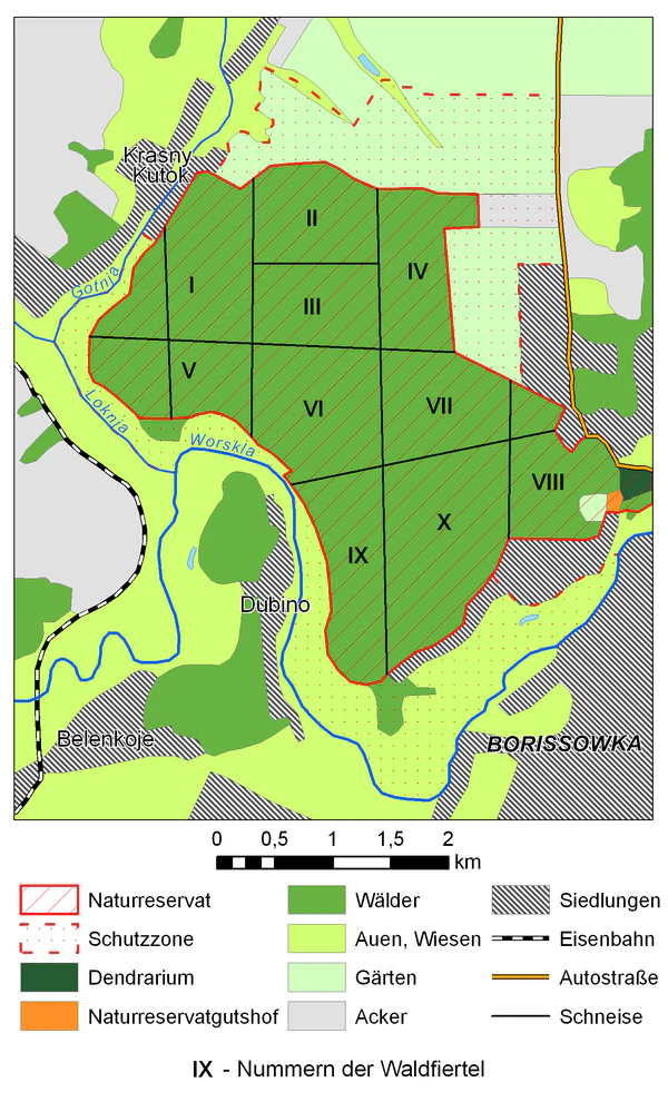 Участок расположен поблизости от райцентра Борисовки и находится в лесостепной зоне. Для этих мест изначально характерны были нагорные дубравы, тянущиеся по высоким правым берегам рек, остепненные участки и поросль байрачных лесов. В результате хозяйственной деятельности человека издревле заселявшего эти места, степи были почти полностью распаханы, нагорные дубравы сводились. Однако поблизости от Борисовки сохранилась реликтовая трехсотлетняя дубрава, давшая начало будущему заповеднику. Вплоть до революции этот лес по тем, или иным причинам находился под охраной: в XVII веке здесь пролегала Белгородская засечная черта, позже Пётр I, которому требовался отборный лес для строительства флота, запретил поруб деревьев в лесах, тянущихся вдоль рек, входящих в бассейн Днепра и Дона, а с начала XVIII века Борисовку приобрел сподвижник Петра I Б. П. Шереметьев. Вплоть до начала XX века дубрава использовалась потомками Шереметьева, как охотничье хозяйство. Вырубки там не велись, проход в лес был строжайше запрещен, лес охранялся. В начале XX века в 13 километрах от Борисовки прошла железная дорога и была открыта станция Новоборисовка. Появилась возможность вывозить строевой лес и владельцы угодий начали систематические вырубки. После революции начались и крестьянские порубки.