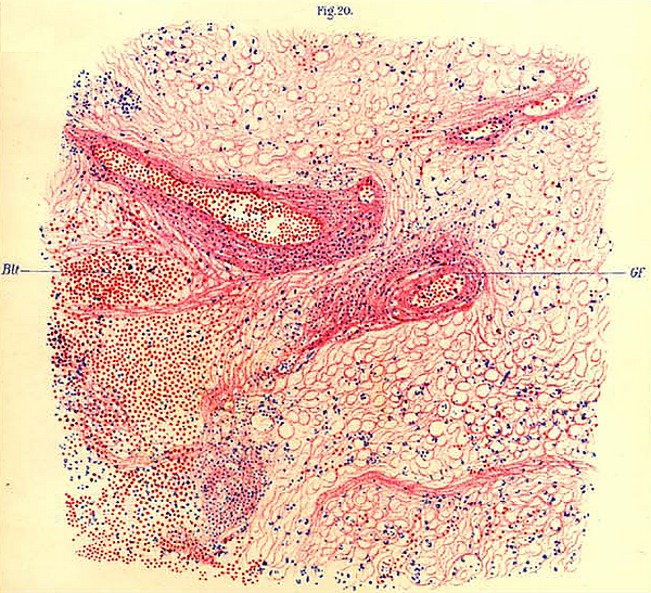 Для эпидемического энцефалита характерно поражение базальных ядер и ствола мозга. Страдают преимущественно клеточные элементы. При микроскопии обнаруживаются выраженные воспалительные изменения: периваскулярная инфильтрация мононуклеарами и плазматическими клетками в виде муфт, значительная пролиферация микроглии, иногда с образованием глиозных узелков. В хронической стадии наиболее выраженные изменения локализуются в чёрном веществе и бледном шаре. В этих образованиях отмечаются необратимые дистрофические изменения ганглиозных клеток. На месте погибших клеток формируются глиозные рубцы[19].