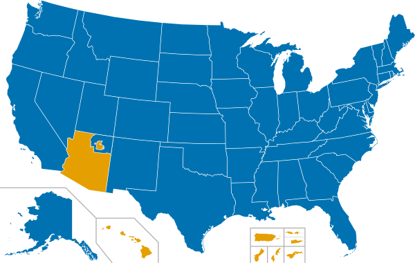 Большая часть Соединённых Штатов соблюдает летнее время, практику перевода часов на один час вперёд, когда световой день длиннее, чтобы вечером было больше дневного света, а утром меньше. Исключение составляют Аризона (за исключением индейцев навахо, которые соблюдают летнее время в племени навахо)[1] Гавайи, а также территории Американского Самоа, Гуама, Северных Марианских островов, Пуэрто-Рико и Виргинских островов США. Закон о едином времени 1966 года установил систему единого летнего времени на всей территории США..[1]
