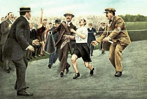 Во время забега произошёл случай, который стал одним из самых громких событий Олимпиады. Итальянец Дорандо Пьетри, вышедший в лидеры за милю до стадиона, на стадионе стал терять ориентацию, несколько раз падал; с помощью судьи и журналиста (которым по некоторым сведениям был писатель Артур Конан Дойль) он пересёк финишную черту со временем 2 часа 54 минуты 46 секунд[15], но был дисквалифицирован за получение посторонней помощи[16]. В итоге чемпионом стал американец Джон Хейз (его результат был лучше, чем у победителей предыдущих Игр, хотя дистанция стала длиннее), а Пьетри получил специальный приз — золотую чашу — из рук королевы.