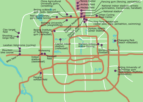 Строительство всех пекинских олимпийских объектов было начато к маю 2007 года[5]. Китайское правительство также проинвестировало реконструкцию и сооружение 59 тренировочных баз и площадок.