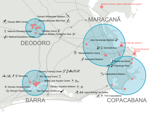 Три других кластера в Рио-де-Жанейро — пляж Копакабана (4 места проведения соревнований, на самом знаменитом пляже построена «Арена Копакабана» для пляжного волейбола), Маракана (4 объекта, включая стадион «Маракана», где прошли церемонии открытия и закрытия Игр) и Деодоро (9 сооружений). Примечательно, что впервые с 1900 года стадион, где проходят церемонии открытия и закрытия летних Игр («Маракана»), не будет принимать соревнования легкоатлетов (они будут соревноваться на Олимпийском стадионе имени Жуана Авеланжа).