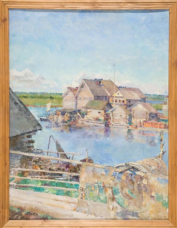На полотне представлен пейзаж, изображающий уголок северной деревни на берегу залива. На переднем плане расположен дощатый тротуар с деревянными перилами, на которых справа развешены рыболовные сети. Слева виден угол серого деревянного сарая. На втором плане изображена группа построек с пирсом, сетями и лодками на воде. Вдали тянется зелёная полоса лесистого берега. Голубое небо с низкими перьевыми облаками завершает композицию.