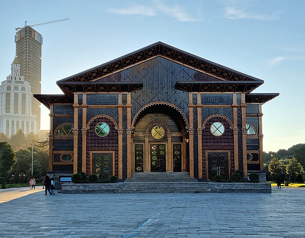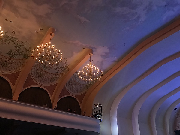Фасад отделан деревом различных пород и украшен декоративной резбой. Потолок стилизован под звёздное небо.[7]