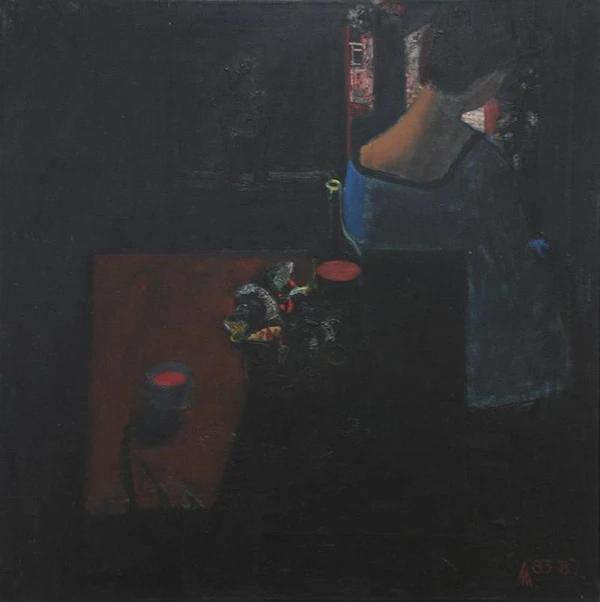 На картине представлен интерьер комнаты, выполненный в тёмных тонах. На переднем плане находится стол с бутылкой, чашкой и закуской, что подчёркивает принадлежность работы к бытовому жанру. Во втором плане изображена женская фигура, сидящая спиной к зрителю на табурете у окна, что придаёт сцене атмосферу уединённости. Композиция построена с акцентом на глубину пространства и детали повседневной жизни.