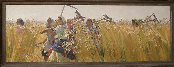 На картине изображена сцена из повседневной жизни: через густое поле пшеницы движется бригада женщин с граблями и литовками. Высокая пшеница почти полностью скрывает фигуры, отчётливо видны только лица и яркие платки. Женщины идут вправо вдоль полотна, что подчёркивает динамику композиции.