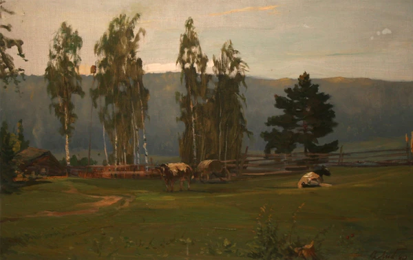 На полотне изображён пейзаж с окраиной деревни на переднем плане. Перед зрителем развёрнута зелёная поляна, в центре которой расположены две коровы: одна стоит, вторая лежит; неподалёку стоит телега с бочкой. Слева видна покосившаяся изба, от которой вдоль поляны тянется изгородь. За изгородью возвышаются редкие высокие берёзы и раскидистая сосна. Задний план занимает сплошной лес в туманной дымке, над которым раскинулось светлое, безоблачное небо. В нижнем правом углу холста автор оставил подпись «А. Либ 40». На обороте в нижнем левом углу на бумажной наклейке авторучкой указаны реквизиты работы.