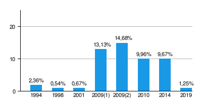 На парламентских выборах 2014 года Либеральная партия получила 9,67 % голосов избирателей и 13 (из 101) мест в парламенте страны.