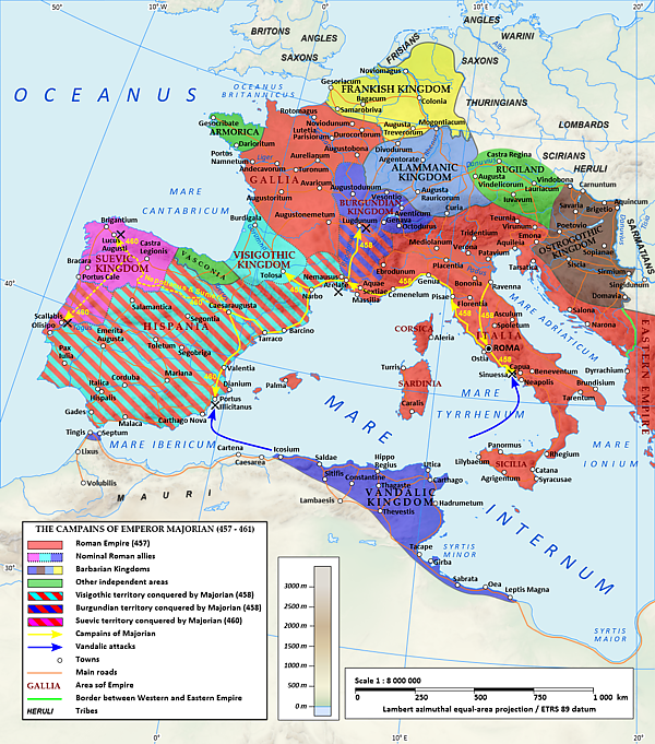 Теперь Рицимер стал фактическим правителем Италии. В апреле 457 года он провозгласил императором военачальника Майориана. Тот простил налоговые недоимки, попытался прекратить произвол администрации, укрепил императорскую власть в провинциях. Майориан разгромил готского короля Теодориха II и вернул под контроль Рима Испанию и большую часть Галлии. Затем император решил отомстить вандалам. В кратчайшее время в Испании было построено триста кораблей. Однако Гейзерих неожиданно напал на римский флот, часть которого он сжёг, а часть захватил. В августе 461 года неподалёку от Тортоны в армии начался мятеж при поддержке Рицимера. Майориана вынудили сложить с себя императорские полномочия. Вскоре он умер — либо был убит, либо стал жертвой болезни[19].