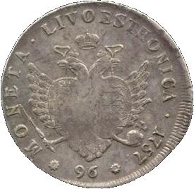 | Описание | Совмещённые гербы Российской империи и двух губерний и надпись «MONETA · LIVOESTHONICA · 1757 ✸ 96 ✸» |