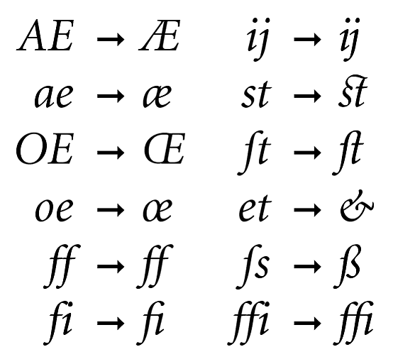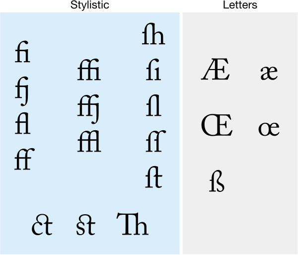 Иногда используются лигатуры для st (st), ſt (ſt), ft, ch, ck, ct, Qu и Th (например, в шрифте Linux Libertine).