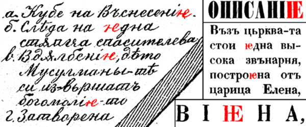 ). В шрифтах научных работ XIX века, а также в некоторых книгах болгарской гражданской печати середины того же века встречается в виде лигатур ІЕ, ıe (ꭡ).