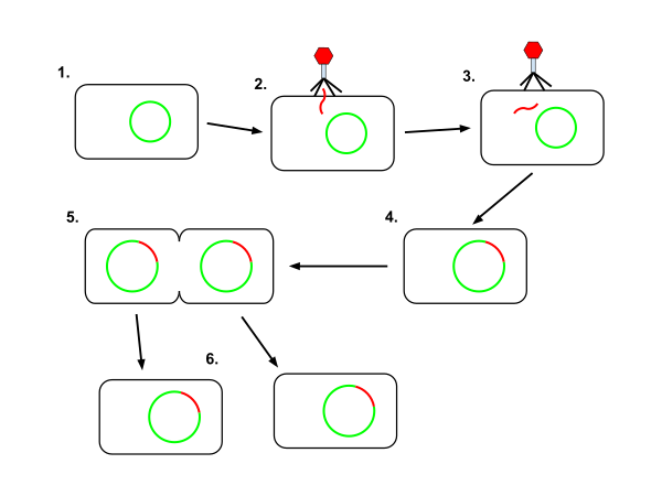 Когда репрессор образует контур поддержания собственного синтеза, ДНК фага встраивается в геномную ДНК бактерии. Встраивание обеспечивается белковым продуктом гена int, который также входит в лизогенный регуляторный контур[8].