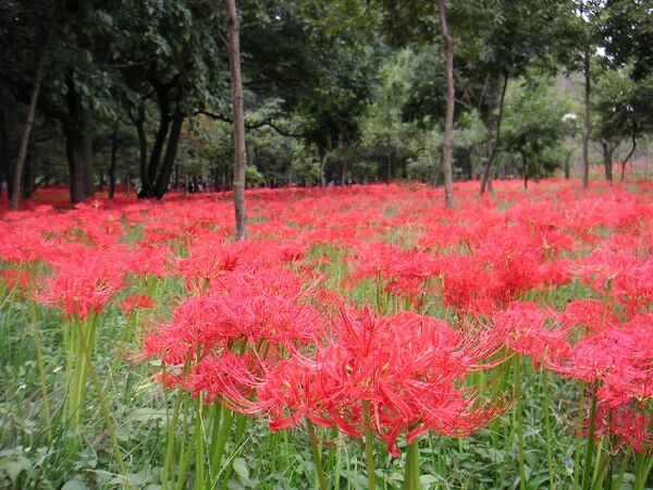 Поскольку эти алые цветы обычно цветут рядом с кладбищами в период осеннего равноденствия, в японском и китайском переводах «Лотосовой сутры» они описаны устрашающими цветами, растущими в Диюй (загробный мир, ад), или Хуанцюань (кит. 黄泉), что направляют мёртвых к следующей реинкарнации.