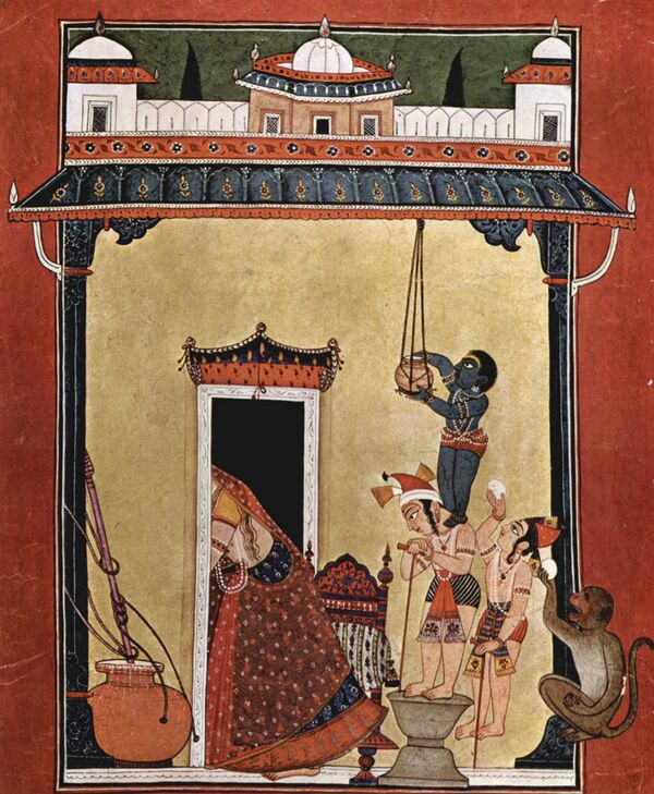 … С его губ, подобных нектару, льются сладкие звуки, что даруют голос опьяняющей свирели; он глядит по сторонам, качает головой, у щек его дрожат серьги. — Мое сердце помнит Хари, веселящегося здесь в раса-лиле и смеющегося [над мной] [7].— Джаядева. «Гитаговинда», XII век