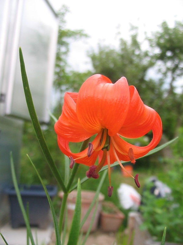 Цветение с июня по август одиночным свежим оранжевым душистым цветком или несколькими (при выращивании до 20) килеватыми цветками в метёлке с блестящей текстурой. Гермафродитные цветки трехзубчатые. Шесть одинаковых по форме лепестков (чашелистиков) сильно изогнуты (форма Türkenbund) и имеют длину от 4 до 8 см. Основной цвет цветков светло-красный без пятен или с несколькими пятнами у основания. Каждый цветок содержит три карпеля и шесть тычинок. Пыльники жёлтые, пыльца пурпурная, а нити длиной 12-25 мм красновато-белые. Нектарии папиллозные с обеих сторон. Семена созревают в удлинённых семенных капсулах длиной до 1,8 см с сентября по октябрь и прорастают сразу же — эпигаевидно[4].