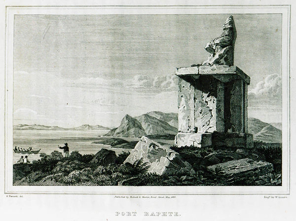 Уильям Мартин Лик был в Греции четыре раза с 1802 года. Лик сообщает, что статуя «портного», вероятно, изображает римского императора[19]. Лик впервые пытается дать датировку по стилю, в целом верную — II век н. э. и позже. Меньшую из статуй Лик не упоминает, вероятно, она исчезла. Эдвард Додвелл 2 сентября 1805 года выехал из Афин с сэром Чарльзом Монком и Уильям Гелл. В Порто-Рафти они прибыли ночью 3/4 сентября. Они посетили острова Рафти и Рафтопула. Додвелл сообщает, что колосс, вероятно, изображает Аполлона, культ которого был на Делосе и в деме Прасии. На другом острове Додвелл видел мраморную нишу, в которой вероятно была небольшая статуя[20]. Додвелл изобразил остров Рафти и первым упоминает исчезновение меньшей статуи. Уильям Гелл не сообщил ничего нового, но поддержал предположение Лика, что колосс изображает римского императора[21]. Джон Моррит сообщает[22] о деятельности Луи-Франсуа-Себастьяна Фовеля и намекает на причастность Фовеля к исчезновению меньшей статуи с Рафтопулы. Сэр Джон Хобхаус, компаньон лорда Байрона посетил Порто-Рафти в 1809/1810 году и поддержал Чендлера в том, что остров Рафти служил маяком[23]. Кристофер Уордсуорт посетил Порто-Рафти в 1832/1833 году. Он кратко упомянул статую в книге «Афины и Аттика»[24], описывал в книге «Греция» и поддержал предположение Лика, что колосс изображает римского императора[25]. Копли Филдинг сделал иллюстрацию к «Греции» Уордсуорта на основе рисунка Додвелла[3].