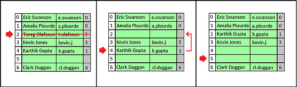 Таким образом, при очистке ячейки i необходимо просмотреть последующие ячейки, пока не найдём пустую ячейку, либо ключ, который можно перенести в ячейку i (то есть ключ, хеш-значение которого равно или меньше i). Если найдена пустая ячейка, то можно очистить ячейку i и остановить процесс удаления. Если же найден ключ, который можно перенести в ячейку i, переносим его. Это приведёт к увеличению скорости поиска перенесённого ключа, а также очищает другую ячейку в блоке занятых ячеек. Необходимо продолжить поиск ключа, который может быть перенесён на это освободившееся место. Поиск ключа для переноса осуществляется до пустой ячейки, пока не достигнем ячейки, которая изначально была пуста. Таким образом, время выполнения всего процесса удаления пропорционально длине блока, содержащего удалённый ключ[3].