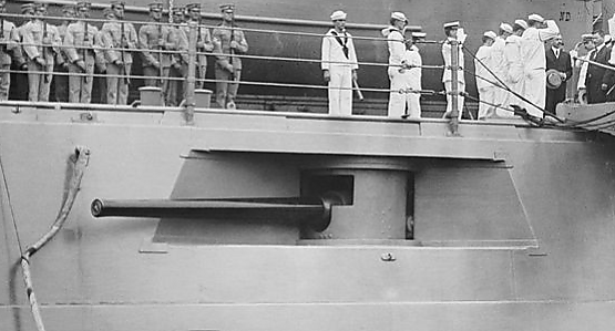 Противоминный калибр состоял из 14 50-калиберных 127-мм орудий Mark 5, расположенных в казематах. Орудие Mark 5 имело длину ствола в 50 калибров и картузное заряжание. Использовались три типа снаряда — бронебойные массой 22,7 кг и 27,2 кг и полубронебойный массой 22,7 кг. Заряд пороха для 22,7 кг снаряда имел массу 9,5 кг, что обеспечивало ему начальную скорость в 914 м/с. Для снаряда в 27,2 кг использовался заряд пороха массой 8,5 кг, что придавало ему скорость в 823 м/с[16]. Из-за расположения на небольшой высоте от уреза воды все орудия заливались во время непогоды, а носовые даже в тихую погоду от носового буруна. Поэтому носовая пара орудий была перенесена на надстройку, а порты этих орудий заделаны. После окончания Первой мировой войны была предпринята попытка заменить их двухорудийными башнями на верхней палубе, оставив только пару кормовых орудий. Но разработка артустановки затянулась, и от этой идеи отказались. В состав вооружения также входили два подводных 533-мм бортовых торпедных аппарата.