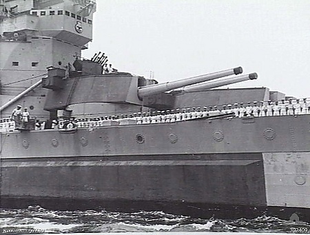 - Наиболее существенным результатом совещания стало решение об изменении состава вспомогательной артиллерии. Вместо 10 башен 114-мм орудий было решено установить 8 двухорудийных башен со 133-мм орудиями. Эти башни разрабатывались для крейсеров ПВО типа «Дидо». Решение о замене было принято несмотря на то, что проектирование новых установок ещё не начиналось, и директор отдела морской артиллерии готов был указать сроки разработки только к концу года[14][13].